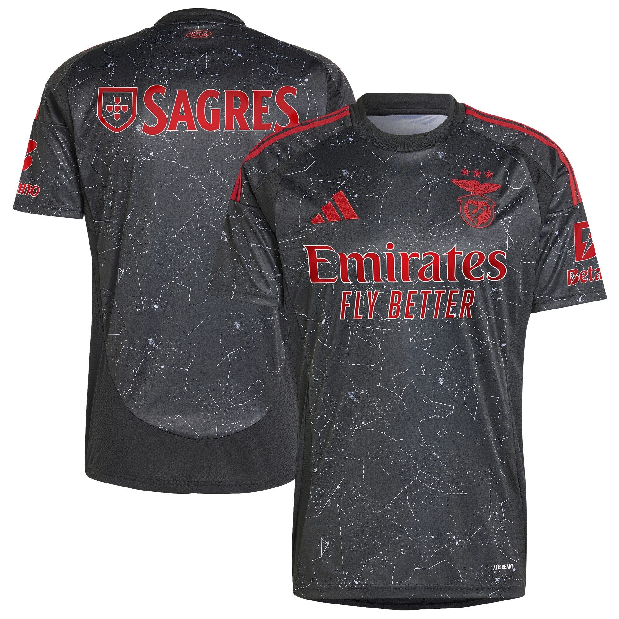 Written in the stars. Benfica celebrate their 120th anniversary in a suitably stellar adidas away jersey. Its bold design displays the star-filled night sky as it appeared above Lisbon on that fateful foundation day. AEROREADY ensures you stay comfortable while you thank the football gods for bringing you and your club together.This product is made with 100% recycled materials. By reusing materials that have already been created, we help to reduce waste and our reliance on finite resources and reduce the footprint of the products we make.